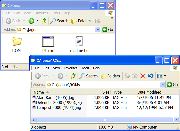 After you have downloaded all required files, your first step is to use WinZip or some other ZIP file-management utility to unpack all of your files. Begin by creating a folder named on your hard drive (in this tutorial we will use a folder named JAGUAR) and unpacking the Project Tempest emulator files into it. While you are at it, also create a folder named ROMs to store your game ROM files, and place your game ROMs in there. After the file extraction your JAGUAR and ROMs folders should look something like the following: