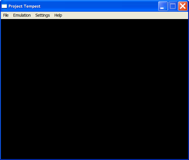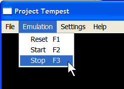 You can reset, start, or stop the emulation at any time by opening the Emulation menu in Project Tempest or by pressing F1, F2, or F3, respectively.