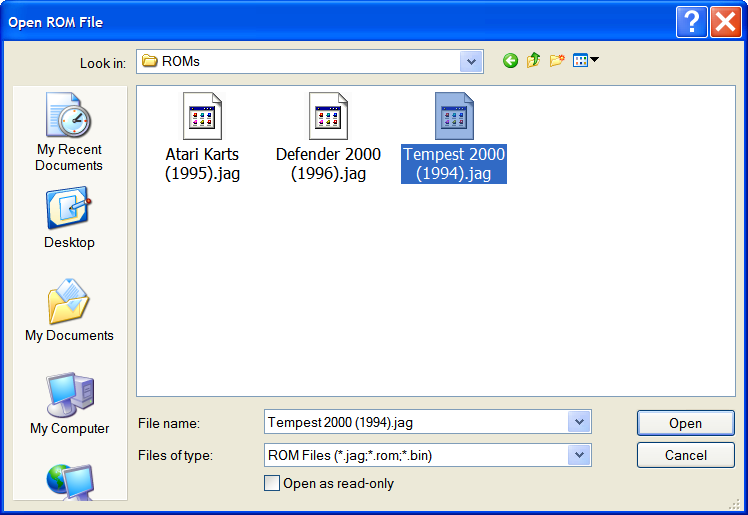 In the Open ROM File dialog box, use the Places Bar and/or the Look in drop-down list to navigate to your Jaguar ROMs folder. Next, select the game to be played and click Open.