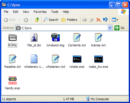 After you have downloaded all required files, your first step is to use WinZip or some other ZIP file-management utility to unpack all of your files. Begin by creating a folder named LYNX on your hard drive and unpacking the Handy emulator files into it. While you are at it, also create a folder named ROMs to store your game ROM files. After the file extraction your LYNX folder should look something like the following: