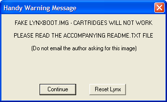 Next, you'll want to place your LYNXBOOT.IMG BIOS ROM in the LYNX folder, overwriting the copy that is already in there. Note that the LYNXBOOT.IMG file that is included with the Handy build is a dummy placeholder file. If you attempt to launch a commercial game ROM by using this dummy BIOS ROM, Handy displays the following dialog box: