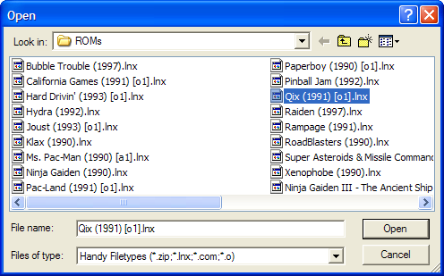 OK, to tie up loose ends: to open another game ROM from within Handy, click File => Load Cartridge, use the controls in the Open dialog box to find the desired game ROM, and then click Open to start the game.
