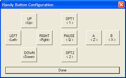 The Handy Button Configuration dialog box makes it simple to map keys on the keyboard to Atari Lynx control and D-pad buttons. To configure a mapping, simply click the appropriate button on the Handy Button Configuration dialog box and type the desired key on the keyboard. Press Done when you're finished.