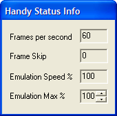 Finally, to check statistics such as frame rate and such, click Help => Emulation status. The Handy Status Info allows you to tweak the emulation speed and view current emulation-related statistics. To dismiss the Handy Status Info window, simply click Help => Emulation status again.